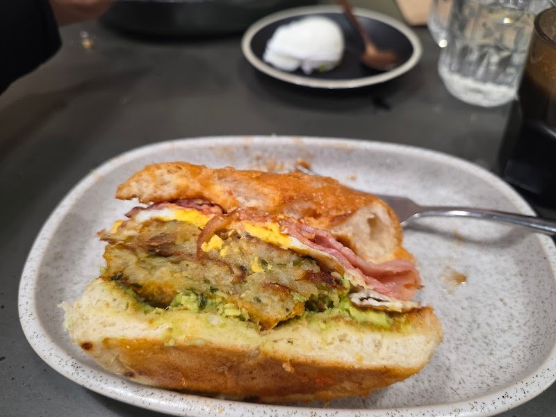3350 Coffee Bar boasts a nice, open, modern interior. However, it was quite cold when we arrived for breakfast, which made the start of our visit a bit uncomfortable. The barista was friendly, and their coffee was enjoyable. Unfortunately, the service from the waitress was less than welcoming. She seemed disengaged and appeared to be just going through the motions, which impacted the overall experience. The smashed avocado looked appealing but lacked flavor. The predominant taste was lime juice, overpowering the other ingredients. On a brighter note, my partner enjoyed the toasty. The cafe has a self-serve water station and toilets located at the back, which are convenient features.