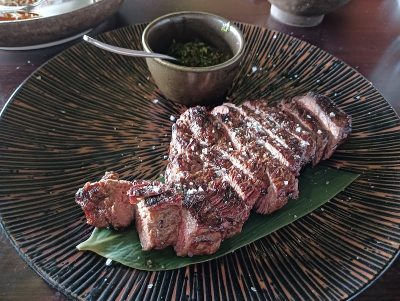 The restaurant has a very nice river view. Smoked butter with bread is a good start of a big meal. Oyster with spicy sauce was so delicious. Octopus was tender and seasoned well. Bone marrow was great. The sause of the steak added points for the steak.