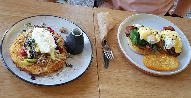 Good food, good service, nice vibe in this cafe. My Eggs Benedict with good quality smoked salmon, slightly runny eggs and asparagus on sourdough was delicious. My wife's savoury mince topped with an egg was also very tasty, the mince just having a touch of sweetness from the fruit. Good value too! I love my coffee but I wasn't a fan of the Kai blend they used, too roasted and lacked a natural sweetness that, in my experience, good blends have. But this a good cafe and next time I'll try a different hot drink!
