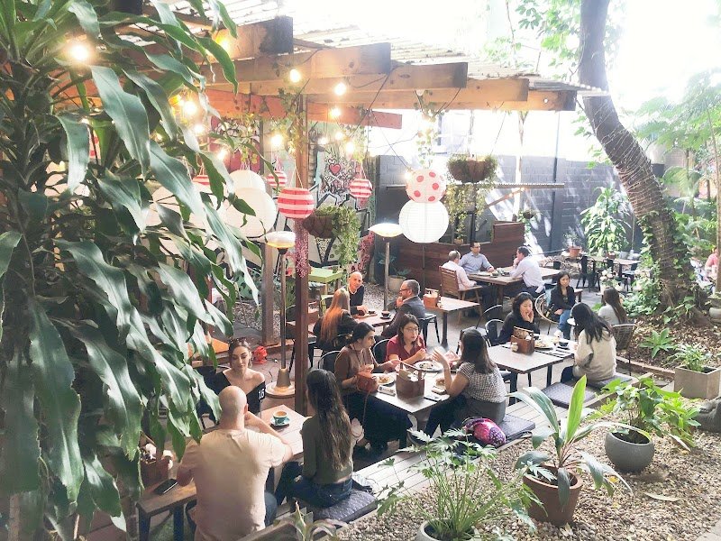 Super cool hippie cafe in the heart of the cbd. Very close about 10 minute walk from Roma street station. Surrounded by towering buildings but has a nice bit of nature tucked away. Coffee is very delicious, same with the matcha. The prices are average for the location with entrees around 20-24$ and coffees around 7-8$. Lots of very cool food options like okonomiyaki, udon, and several different Asian fusion dishes.