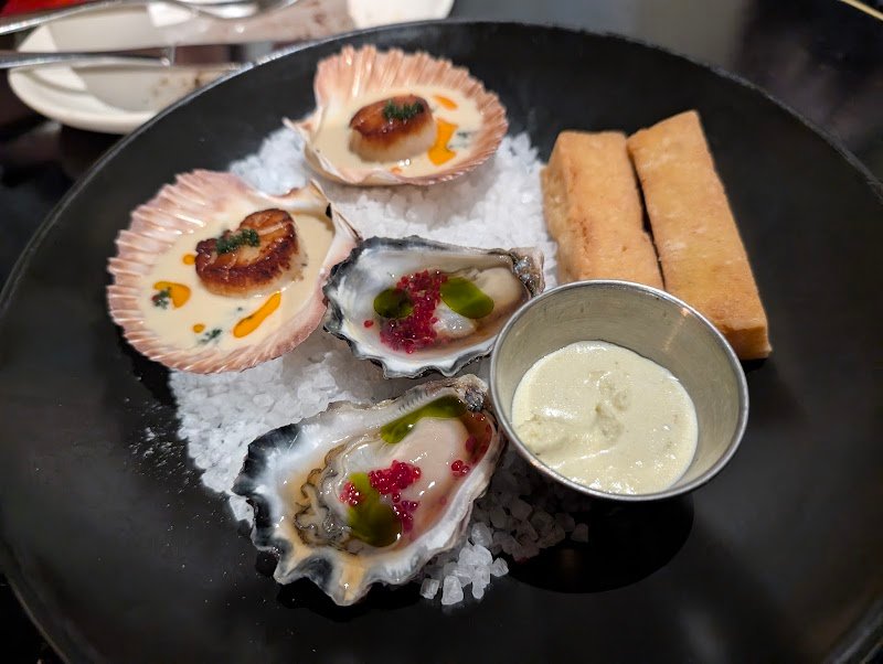 Unfortunately I was let down on my birthday with below average food with extremely high prices. The scallop and oyster were nice to start but it was downhill from there. I wish I had gotten a photo of the burnt and tough spatchcock schnitzel but I took these photos to show my family what I was having for my birthday dinner and I didnโt want them to see that. Please save your money I feel so bad that my partner paid $200+ for us when it was such a disappointment. :( Service and drinks were great.