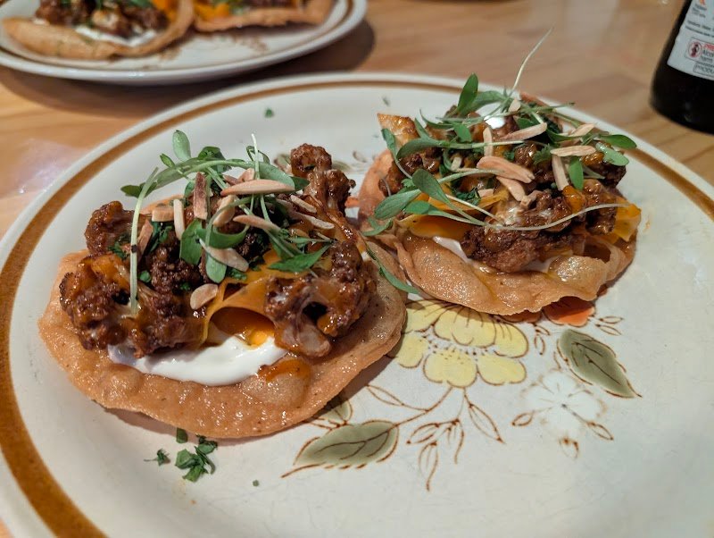 I came in early on a Saturday with no reservation and they were able to seat me immediately. I wanted to try everything and despite being a solo dinner, the lovely waitress recommended her favorites! I ended up going with the cauliflower tostada, roasted cabbage, and โ€œfishโ€ tacos! Everything was incredible, as a vegetarian I am not sure Iโ€™ve ever had such good cabbage or heart of palm! Everything was so so yummy! The staff were so sweet and accommodating!