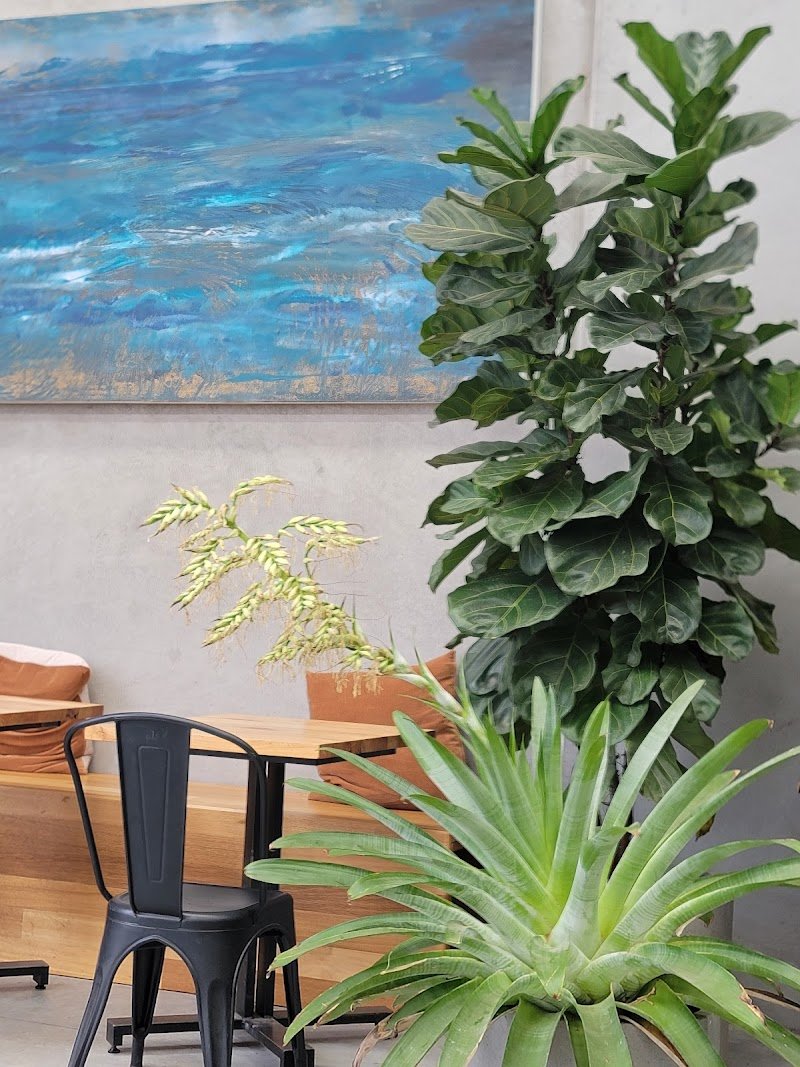 A bright new open space. A well designed space with lots of seating, interesting decor, and plants. Good service, tasty food, and coffee.