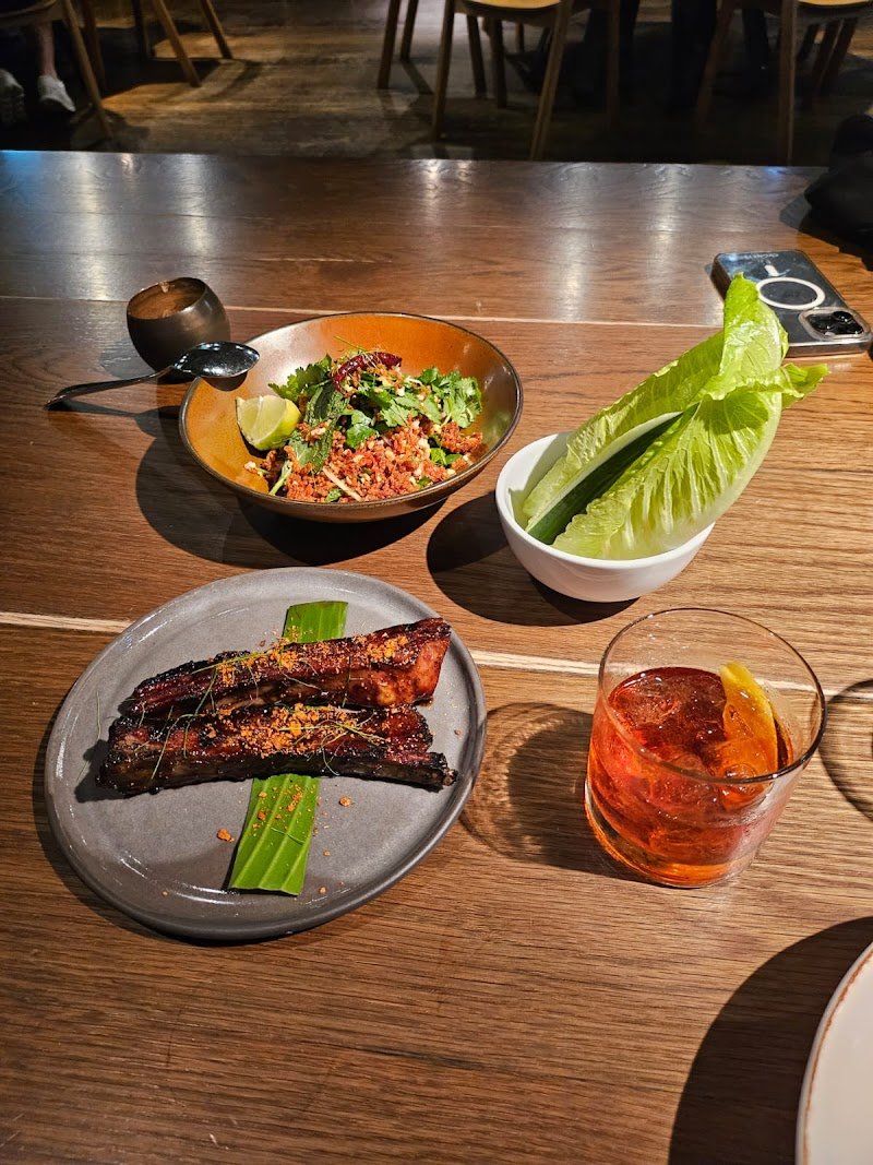 The ambience and lighting was a little too dark. We were seated on a giant log table which ended up being shared with other customers which felt a little awkward. Food was decent but expensive. The ribs had good flavour overall and everything else is what you would expect from a Thai restaurant. The betel leaf was the star amongst all the dishes we had. Perfect balance of freshness from the leaf and fragrant meat within.