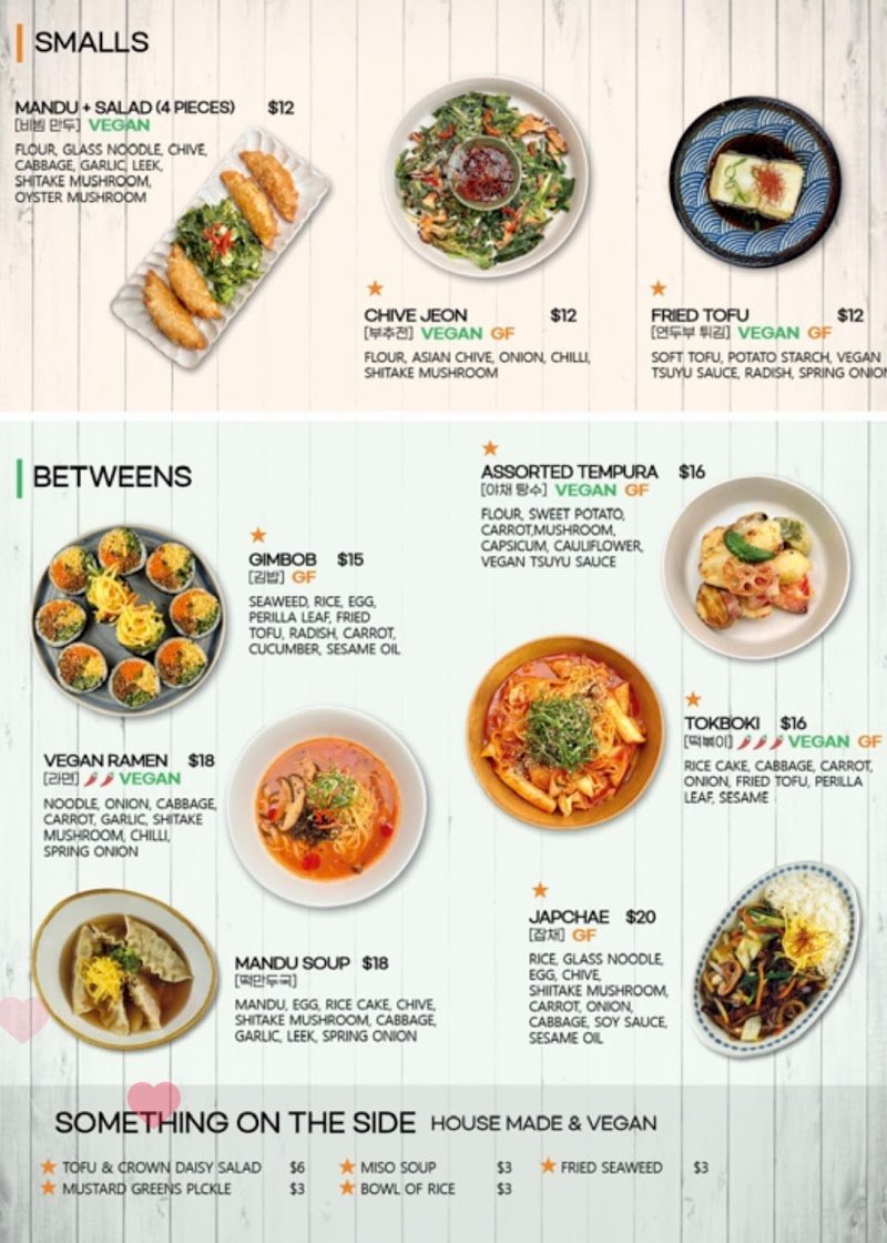 Food was incredible and staff were lovely. There were plenty of vegan options and we had the mandu, chilli fried tofu soban and cold sweet potato latte. It was all amazing and we really appreciate the staff helping us explore and try something new.