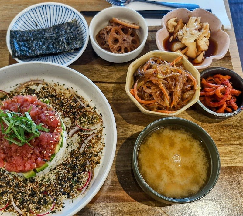 Wonderful dinner experience! Loved the atmosphere, very chill. The service was prompt and friendly. The food was amazing! Got the โSobanโ sets, which have all the little side dishes and they were all so yummy and we were stuffed after inhaling them. They have vegan and vegetarian options available. Prices were also very decent. Will definitely be going back. Edit: Also went back the next morning for coffee and was not disappointed. Great tasting coffee and my partner got a hot sesame latte which was nice too, although it tasted sweetened.