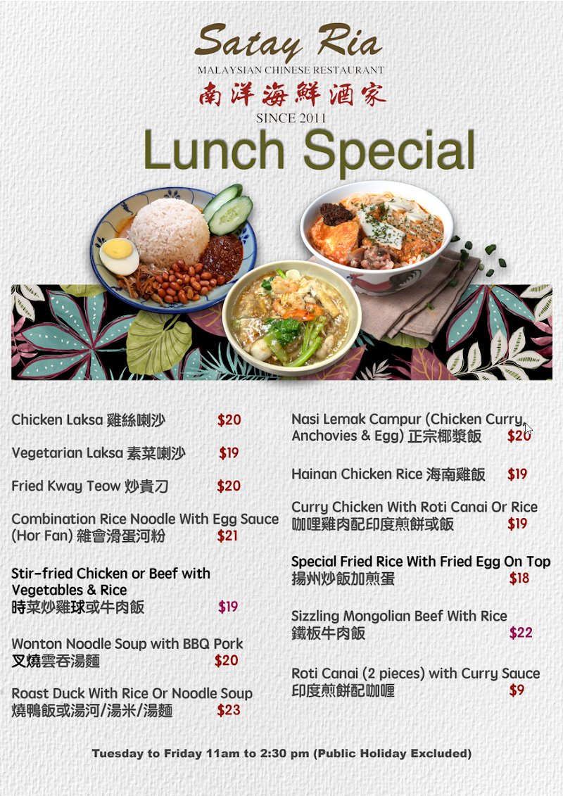 Reserve your spot at Satay Ria Malaysian Chinese Restaurant Cannon Hill (南洋海鲜酒家)