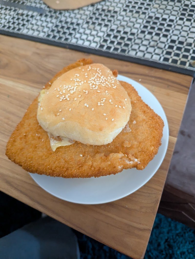 Oml! Have you ever seen a burger so big it doesn't fit in the bag for under $10... Nor had I... Until now!!! This was absolutely amazing. Perfectly cooked, freshest salads I've had in years and that schnitzel is just beyond belief ๐ thanks for the day of a hungry tradie ๐