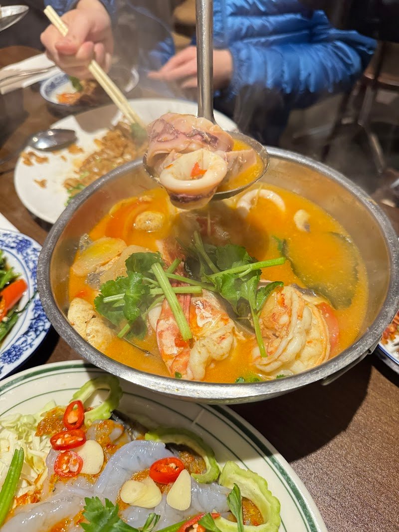 A true hidden gem with the main entrance covered with plastic sheets and no sign. Had been here twice, and the food we were served were impressive. I really love their olive leaves minced pork, which it is a dish that I never seen in other Thai restaurant. Good alternative to gra pow. The squid curry was also very flavoursome. The pad see ew somehow abit too sweet for my liking. The whole place doesn't have a proper air-conditioning, so could be hot during summer.
