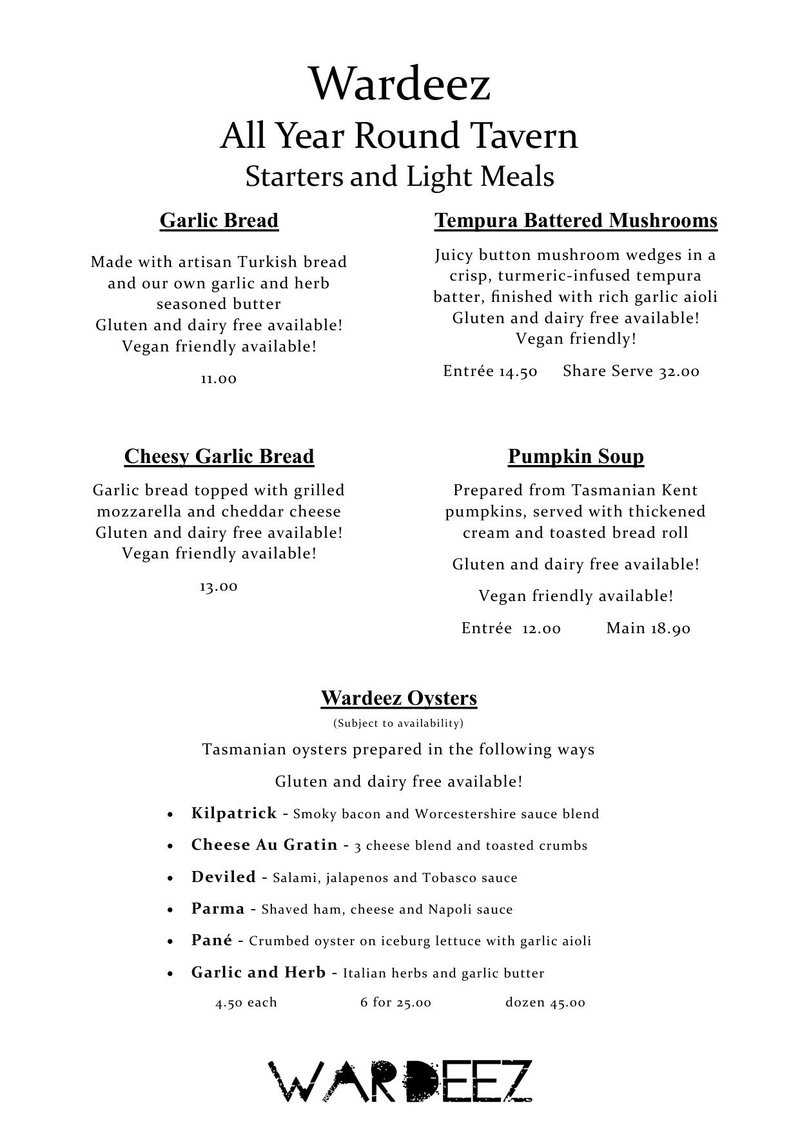 Wardeez Cafe & Bistro is the All Year Round Taverns revamped bistro, offering full a la carte meals lunch 6 days, dinner 5 days. WARDEEZ MENUS BELOW