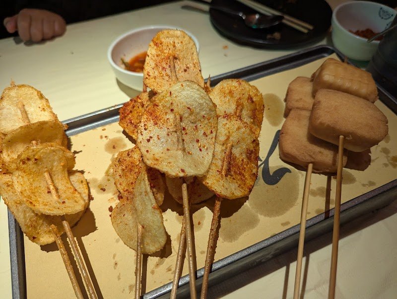 This restaurant features a unique all-you-can-eat skewer concept, though be aware that not all menu items are part of the deal, there is still ample variety to choose from. Note that the skewers are essentially all fried and are bite-sized (recommend ordering heavily upfront; we needed over 60 for two adults and two kids). Service can be slow during peak times, making a large initial order crucial. Beyond the main skewers (favourites were the lamb and enoki mushrooms), side dishes like noodles or fried rice are available to order. They also offer excellent fried bread with condensed milk, as well as buffet sides like kimchi, toffee-like fruit skewers, and a self-serve bingsu machine. Overall, a solid experience if you manage the ordering process correctly.