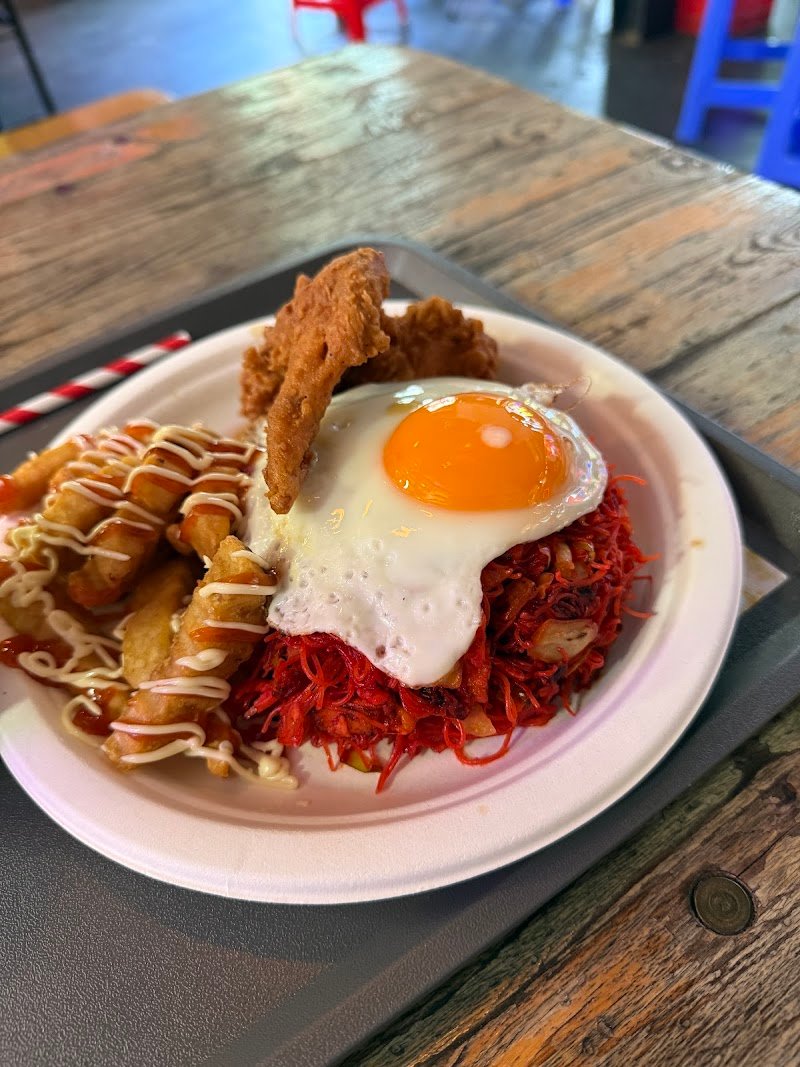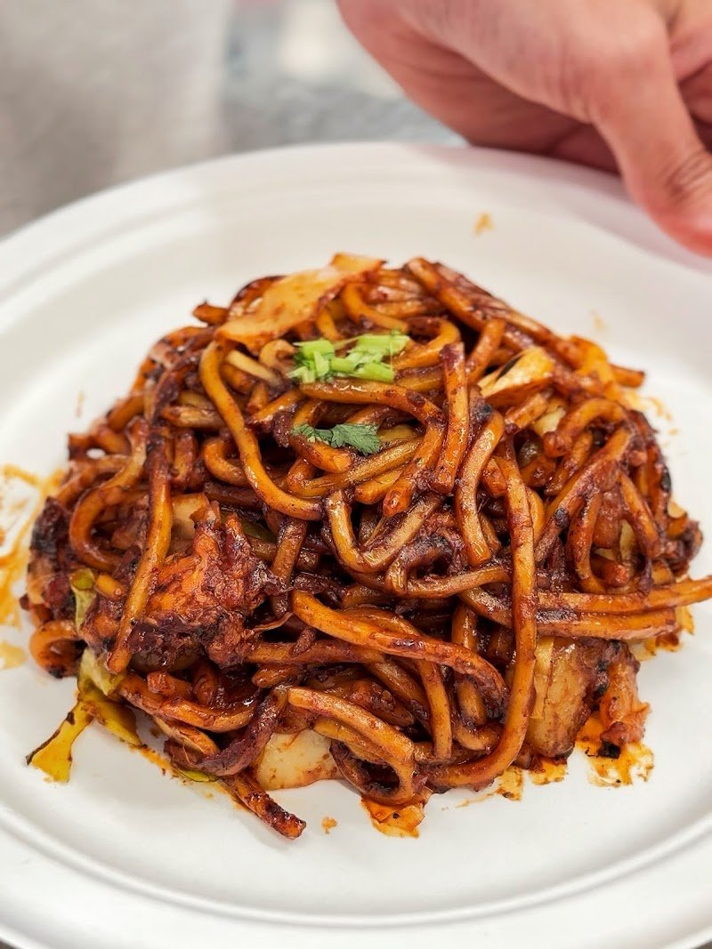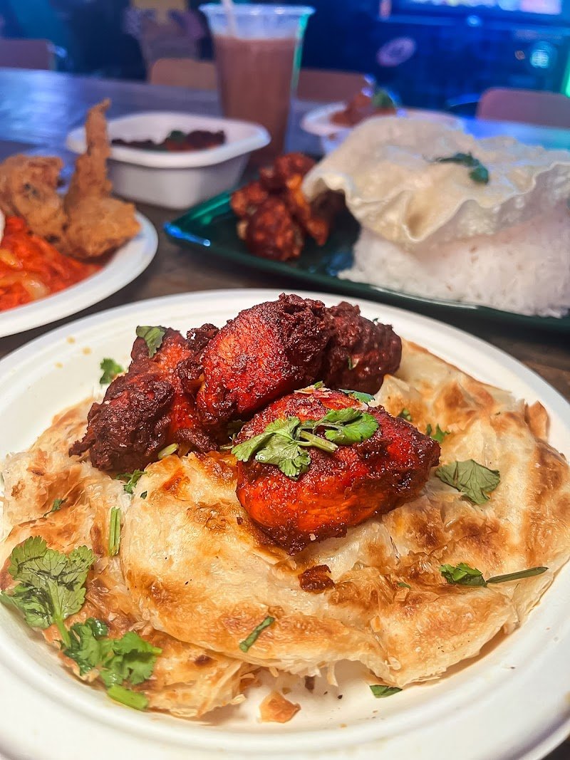 NEW authentic Singaporean and Malaysian Indian food, located in the Ezistreat food hall - their Maggie Goreng is a must! We tried: ๐ Maggie Goreng Combo ๐ซ Roti Canai w/ Chicken 65 ๐ Banana Leaf Set ๐ฅ Curry Chicken ๐ Chicken 65 ๐ Sambal Chicken ๐ง Teh Tarik This was my first time visiting Ezistreat and the food hall was such a vibe! Lepak Corner was decked out with beautiful lanterns along the shopfront so you canโt miss it! Their banana leaf set is their rendition of a traditional South Indian meal, which consists of rice in the middle, surrounded by fragrant gravies and curries for flavour. They also had some yummy little sides, including spiced cauliflower and sweet brinjal - a sweet and savoury eggplant dish. We got a few of their add ons - the sambal chicken and curry chicken were super flavourful and the sauces were great to dip their roti in. We loveeed their maggie goreng, which was rich and spicy with super yummy noodles and crunchy fried chicken on the side - definitely recommend this one!