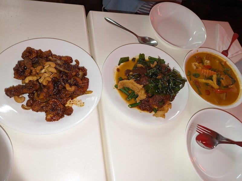 Loved the food. We had chili jam chicken, chu chi fish and roast duck curry. With rice. Atmosphere is cafeteria but worth it for the food.